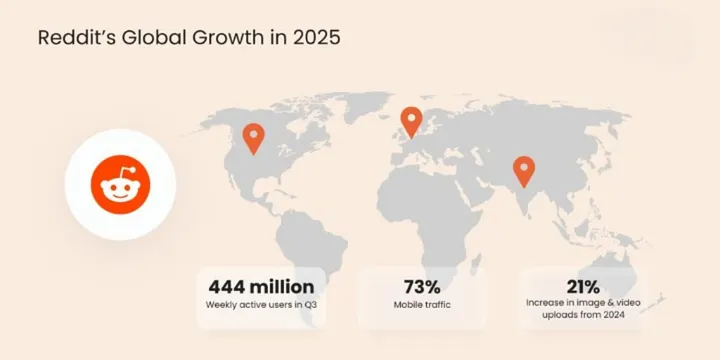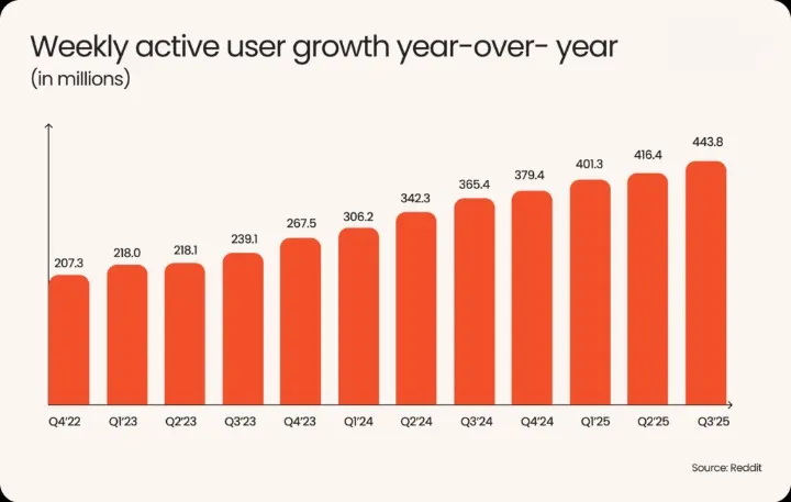 In Q3 2025, Reddit reached nearly 444 million weekly active users — a 21% year-over-year increase.