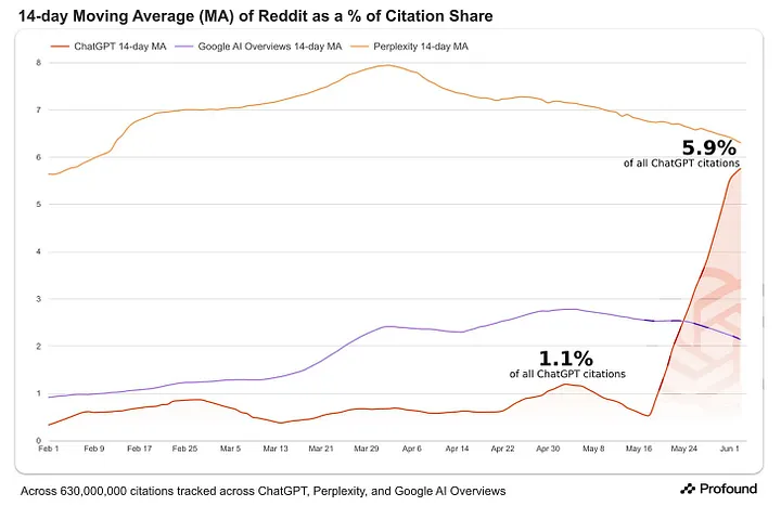 Reddit citations jumped +436% starting on May 19th. Since then, Reddit has absolutely legitimized itself as a major source of truth across answer engines. OpenAI pipes Reddit threads directly into ChatGPT, and Google pays ~$60M a year to license its data.